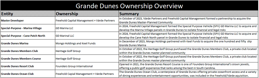 Freehold Capital Management (FCM), headquartered in Boston, MA, is a prominent developer of master-planned communities and build-to-rent neighborhoods. Since its founding in 2013, FCM has focused on a broad range of housing, including residential mixed-use and master-planned developments, as well as concentrated rental communities. These ventures extend from FCM’s Freehold Communities® and 360 Communities® brands. Freehold Communities is one of the nation’s largest developers of award-winning, large-scale, mixed-use, and master-planned communities. And 360 Communities is a fast-growing provider of high-quality new homes for lease. In October of 2023, Värde Partners and Freehold Capital Manage formed a partnership to acquire the Grande Dunes Master-Planned Community.